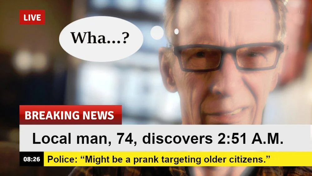 (Ottawa) A local man recently noticed a strange reading on his bedside clock. “It was odd. I sort of woke up, and looked over at the clock. Odd reading - 2:51 AM. I thought: where did that come from?” Apparently, the mystery didn’t end there. “About a week later, I saw a 3:11, and after that 4:52,”, said the good-looking older man. Local police were baffled. According to Officer Les Balvernes, “It might be some kind of prank targeting our older citizens.” The investigation continues.